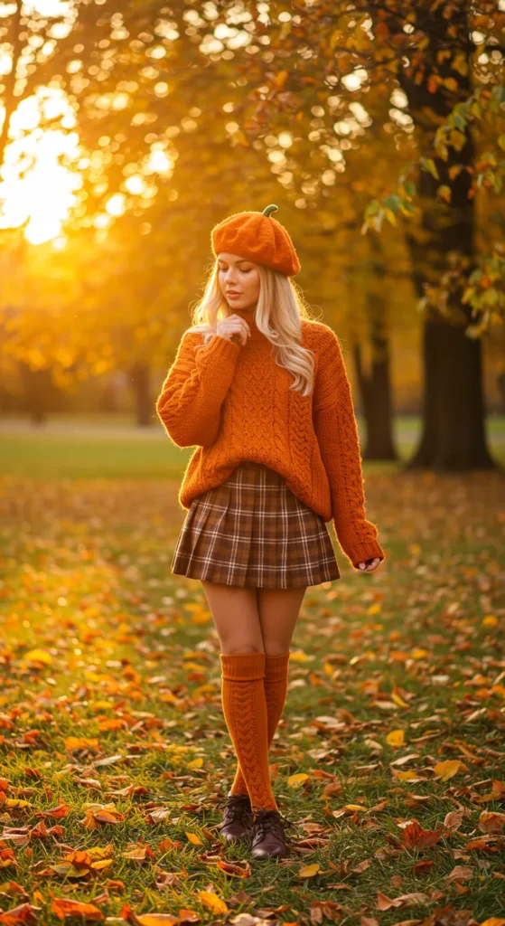 An oversized orange sweater, plaid skirt, knee socks, and a pumpkin beret give strong fall energy. This outfit is cozy, cute, and easy to wear all night.
