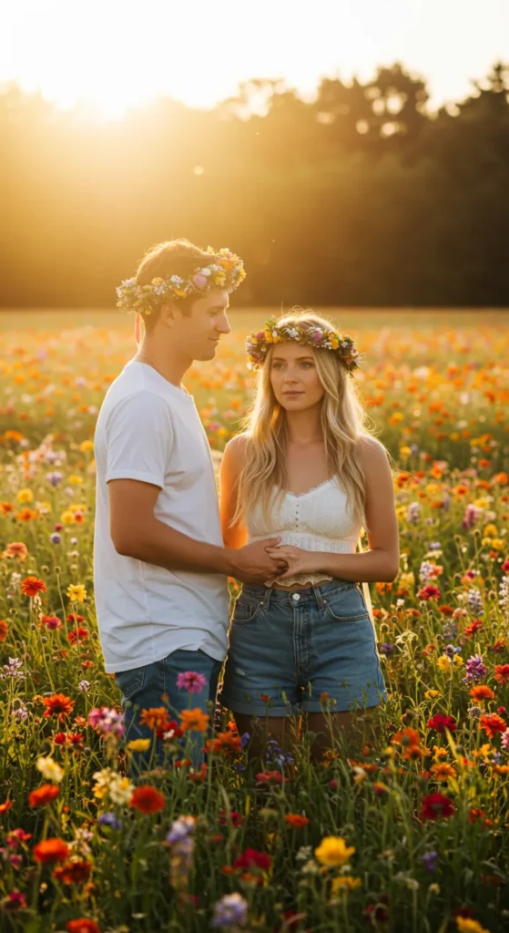 Floral crowns, flowy tops, denim shorts, and light boho jewelry create a dreamy hippie-inspired look. It’s soft, free-spirited, and works beautifully in pairs.
