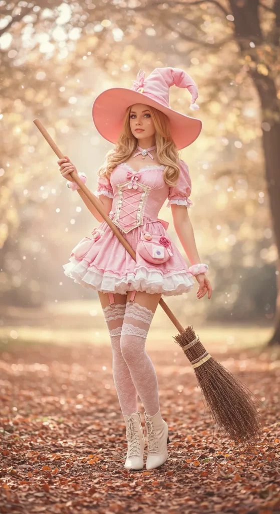 A pastel pink witch hat, matching dress, lace stockings, and white boots make this costume a dreamy take on witchy aesthetics. A small broom completes the charm.