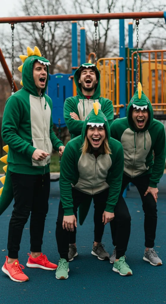A green hoodie with attached felt spikes or a DIY tail, paired with matching joggers, makes for a cute and comfy dinosaur costume. Add a little roar for effect.