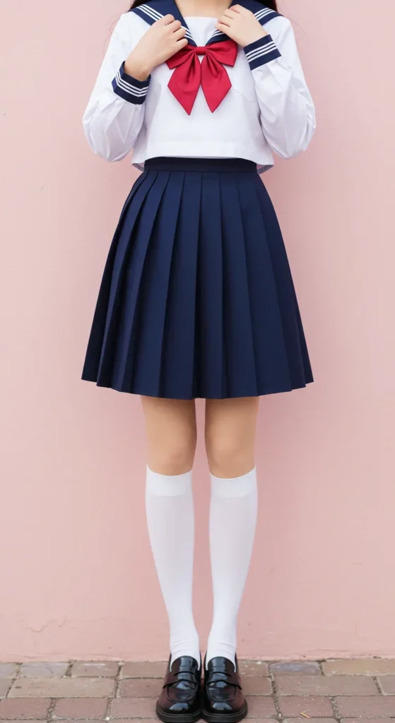 A pleated navy skirt, sailor collar blouse, and a red bow channel classic anime nostalgia. Knee-high socks and loafers make it even cuter.