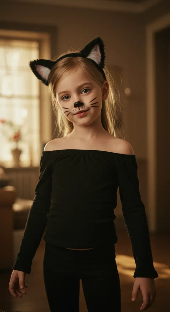 An off-shoulder black top, leggings, kitten ear headband, and soft whisker makeup give this classic a cute upgrade. Add boots or heels to dress it up.