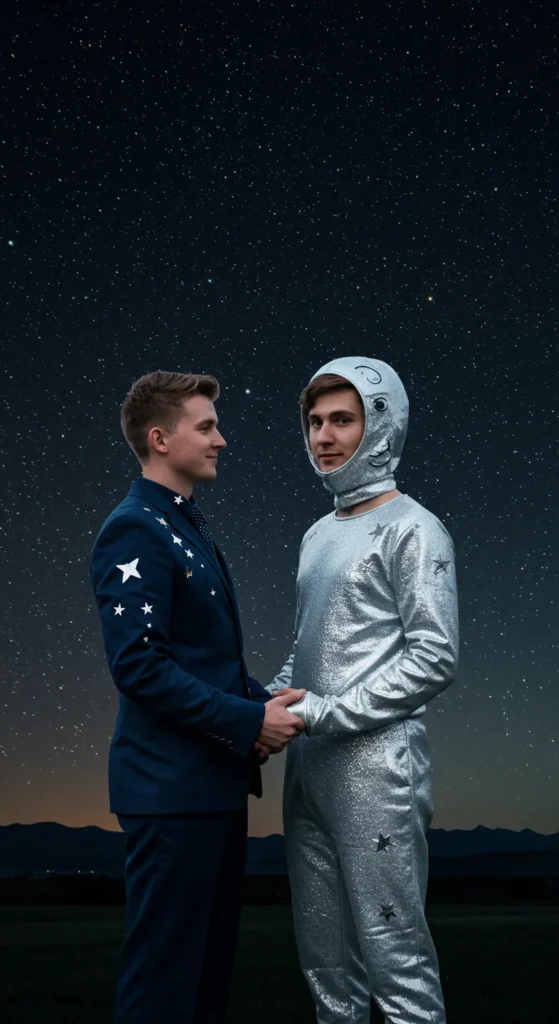 One person wears a deep navy outfit with small star pins or glow-in-the-dark decals, while the other wears white and silver to mimic the moon. It’s poetic, cute, and perfect for couples or friends.