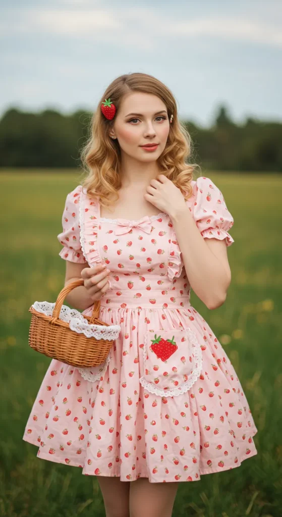 A soft pastel pink dress with a strawberry-print apron or red accessories creates a gentle, fruity vibe. Add strawberry clips or a matching headband, rosy blush, and a small basket bag for a cottagecore-inspired look.