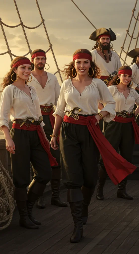 A loose white shirt, black pants or skirt, a red sash, and a bandana create a soft, non-scary pirate look. Add gold hoop earrings or a small hat for flair.