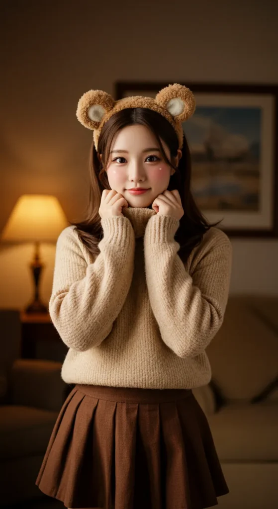 A beige sweater, a brown skirt, and a bear-ear headband make this outfit cozy and sweet. Add soft pink cheeks for a plushy, soft aesthetic.