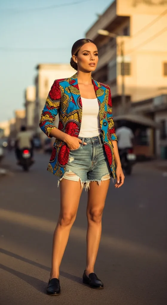 A structured Ankara blazer layered over modest high-rise denim shorts creates a modern cultural blend. It feels city-ready and confident.