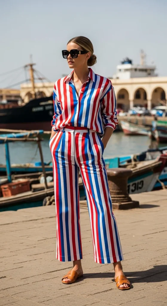 A bold striped cotton co-ord in warm tones feels modern and playful while staying breathable for the climate.