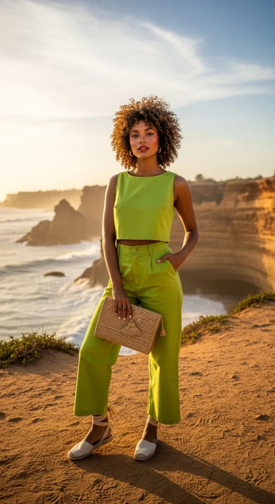 A bright green cotton skirt and cropped blouse set feels joyful and bold. It reflects Dakar’s vibrant personality without feeling overwhelming.