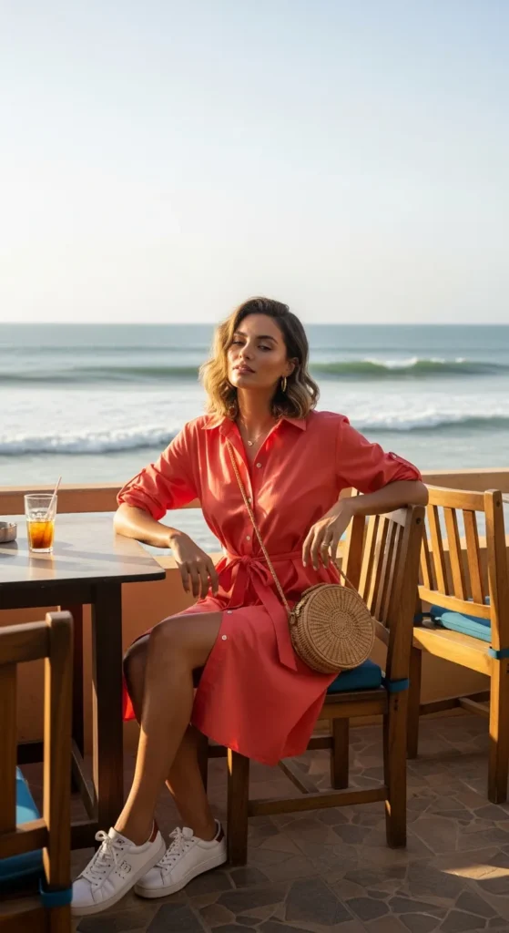 A coral shirt dress with a relaxed waist tie feels fresh and confident. It’s the kind of outfit that works from seaside cafés to art galleries without needing a change.