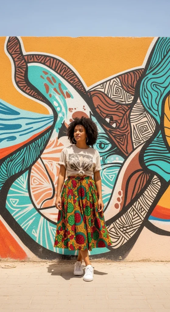 A relaxed graphic tee tucked into a vibrant wax print midi skirt blends casual American energy with Senegalese tradition in a respectful way.