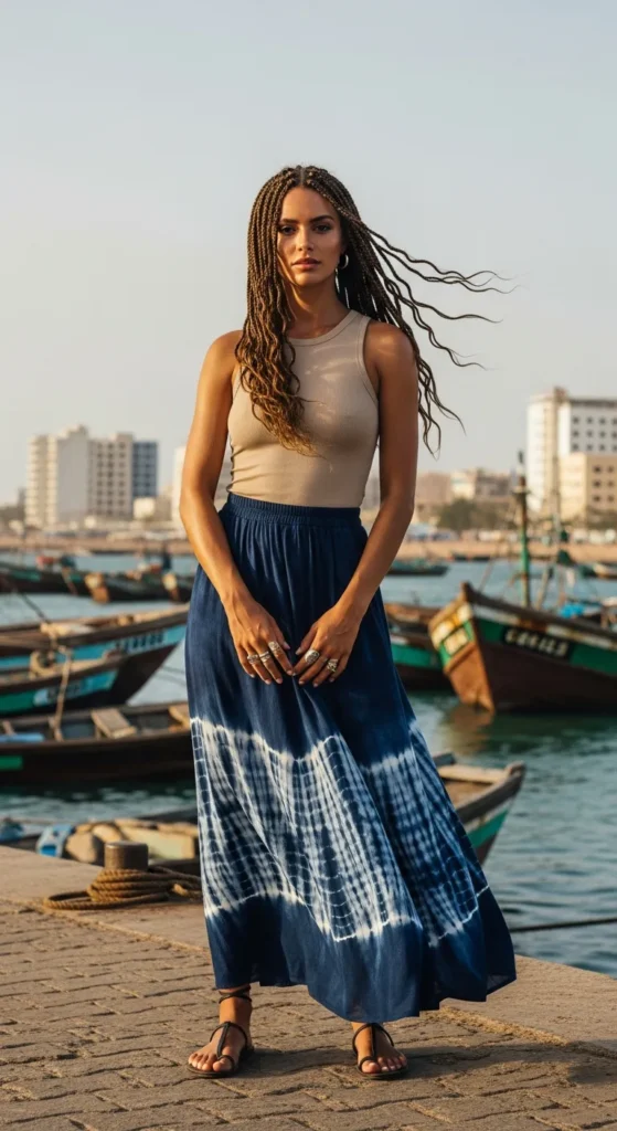 An indigo tie-dye maxi skirt paired with a fitted neutral tank feels artistic and relaxed. The deep blue shades echo traditional dye techniques and coastal depth.
