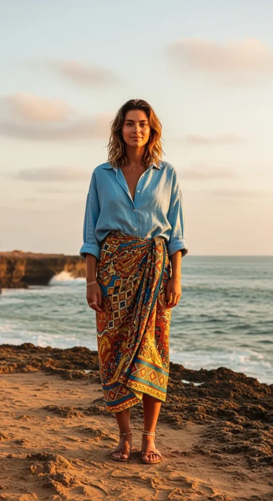 A crisp light blue oversized shirt tucked loosely into a patterned sarong feels easy and beach-ready yet city-appropriate.