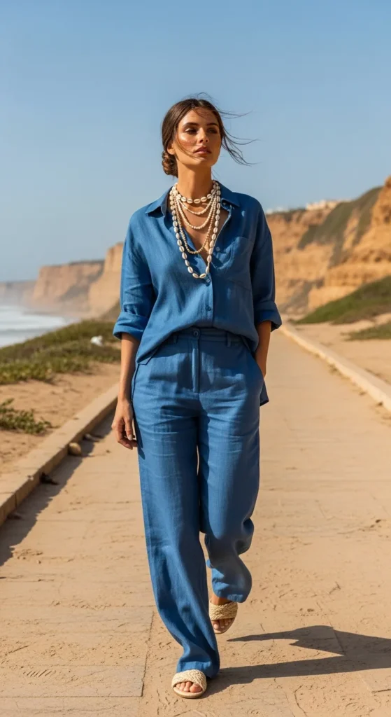 Stylist Suggestion: Roll the sleeves slightly and add layered shell necklaces. It softens the structured silhouette and ties the color story back to the coastal environment in a natural, meaningful way.