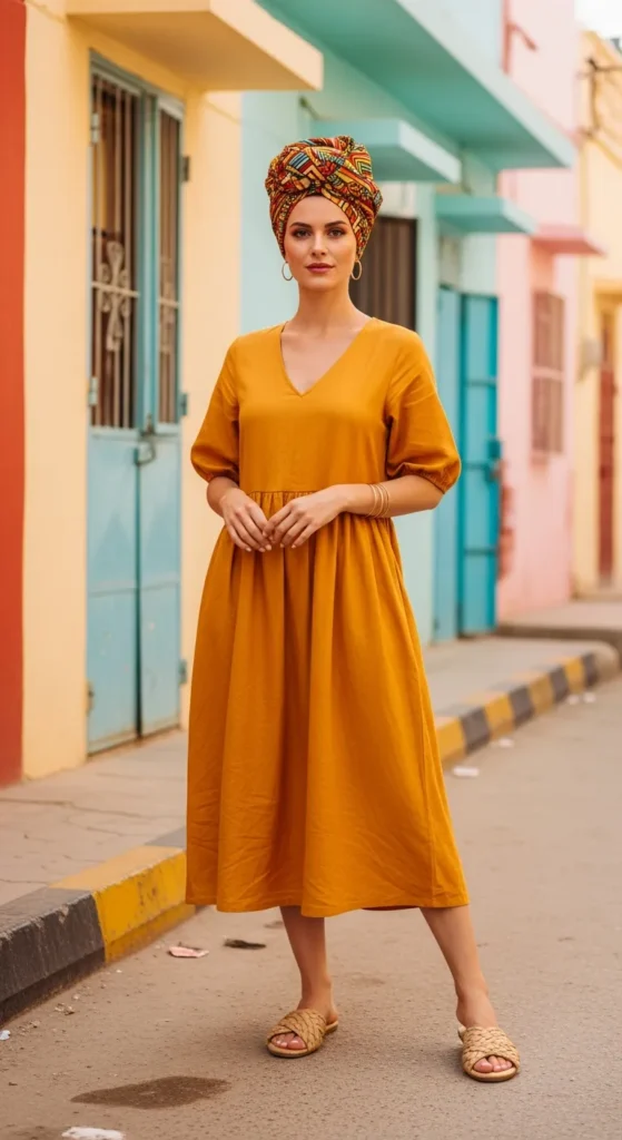 A flowy mustard cotton midi dress paired with a complementary patterned headwrap feels respectful and radiant. The color glows against Dakar’s sunlight and photographs beautifully near sandy streets.