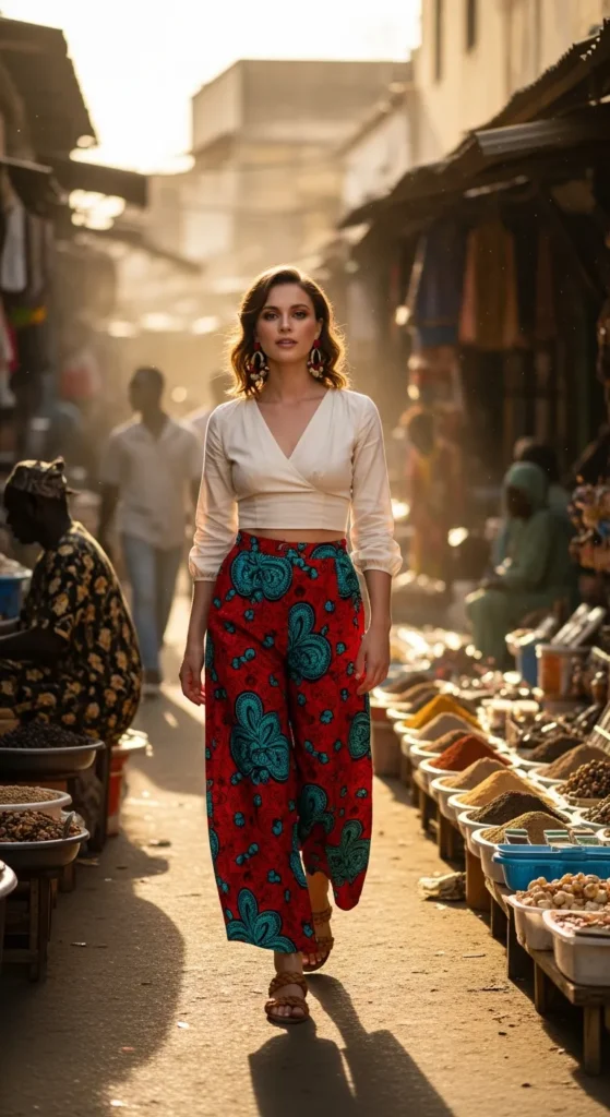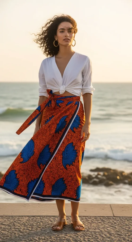 A vibrant kitenge wrap skirt paired with a tucked white cotton blouse feels effortless yet powerful. The movement of the fabric against the coastal wind creates a soft drama that feels authentic and expressive.