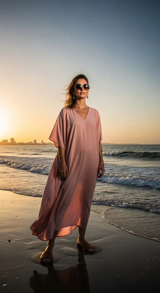 A blush pink cotton kaftan drapes beautifully and allows airflow during humid afternoons. It feels relaxed yet intentional.