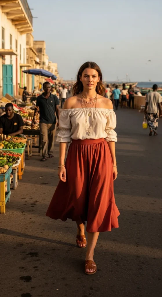 A terracotta midi skirt paired with a soft off-shoulder cotton top feels warm and coastal. The earthy tone complements Dakar’s sandy textures.