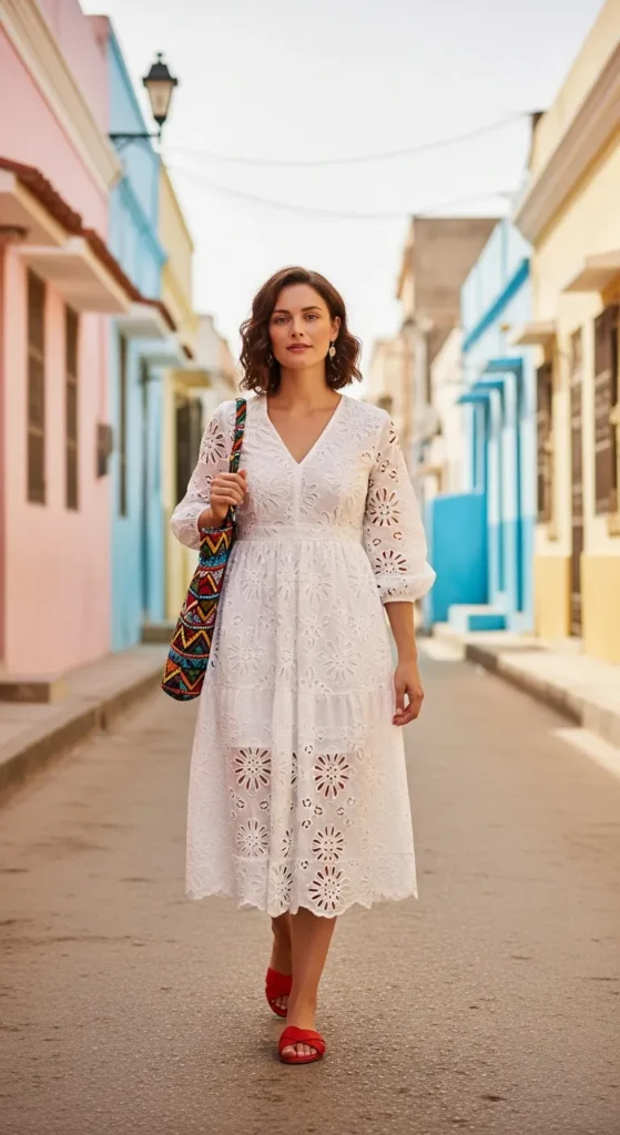 A white eyelet midi dress feels light and romantic, while brightly colored sandals add the Dakar twist. It’s soft but never boring.