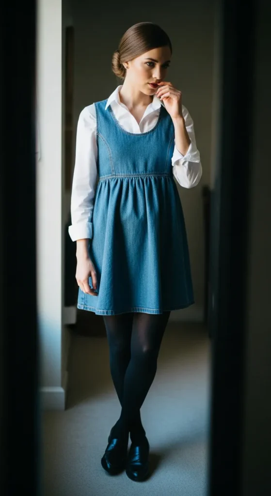 Layering a crisp button-down under a denim babydoll adds structure and warmth. It feels smart yet relaxed, perfect for winter days when you want a polished casual look.