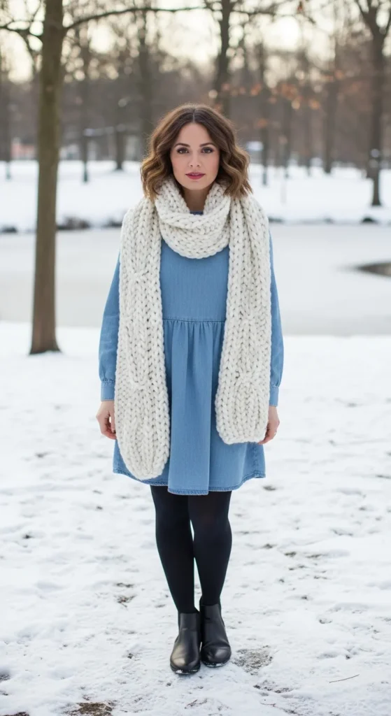 A chunky scarf adds warmth and personality to a denim babydoll winter outfit. It feels cozy, approachable, and perfect for outdoor winter walks or casual meetups.