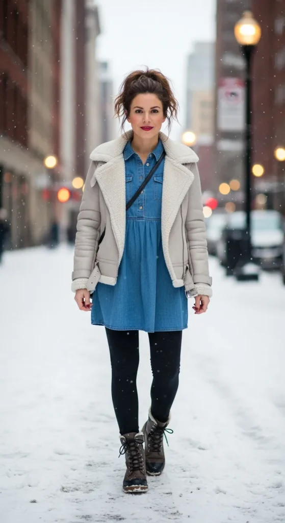 Pairing a denim babydoll with a faux shearling jacket adds texture and warmth instantly. The mix of soft lining and denim creates a playful winter look that feels youthful and practical.