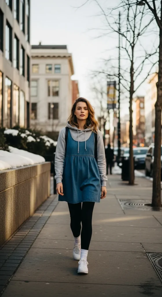 A hooded sweatshirt under a denim babydoll creates a youthful, street-style winter vibe. It feels relaxed, warm, and ideal for casual days when comfort comes first.