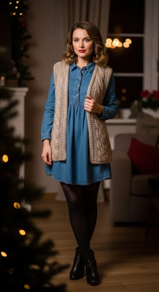 A knit vest over a denim babydoll adds warmth without heaviness. This layered look feels thoughtful and cozy, making it perfect for indoor winter settings or mild outdoor days.