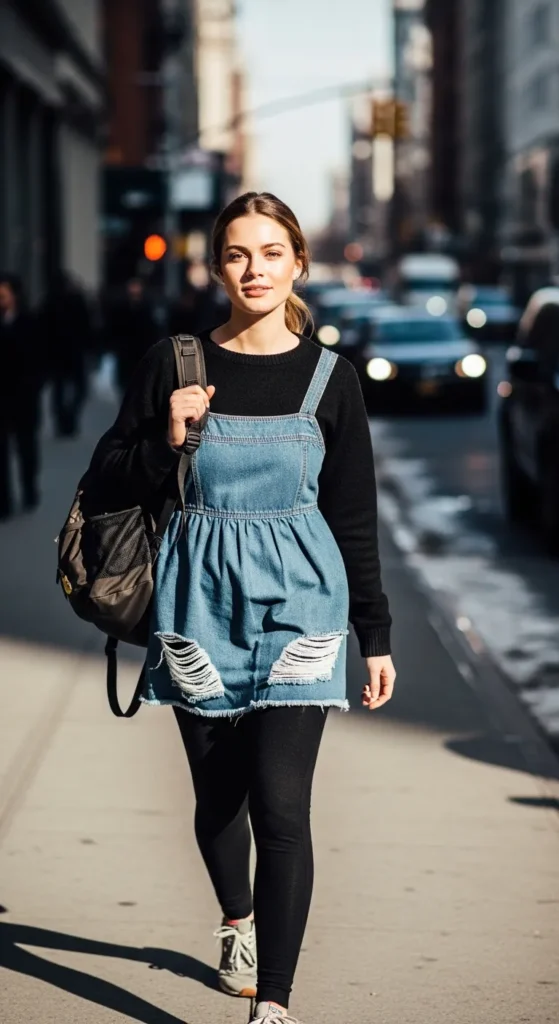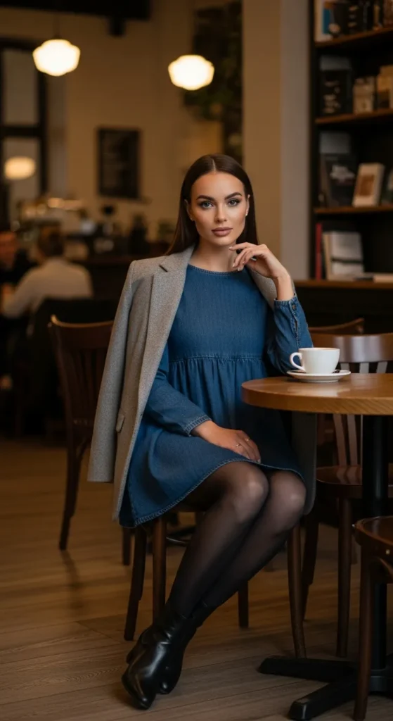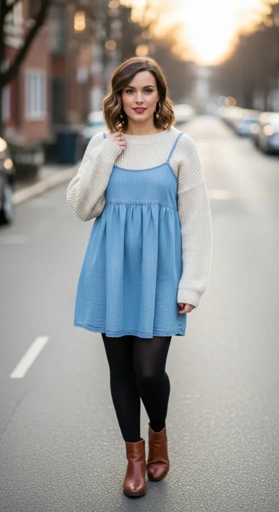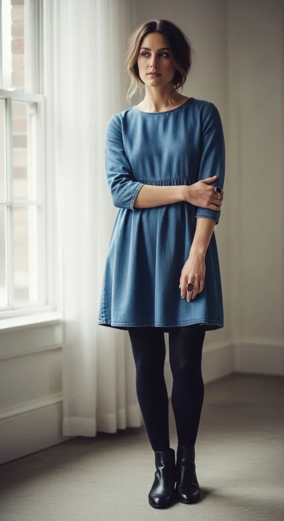 Thermal leggings under a denim babydoll make winter dressing practical without losing charm. This look feels casual, warm, and ideal for busy days when comfort is non-negotiable.
