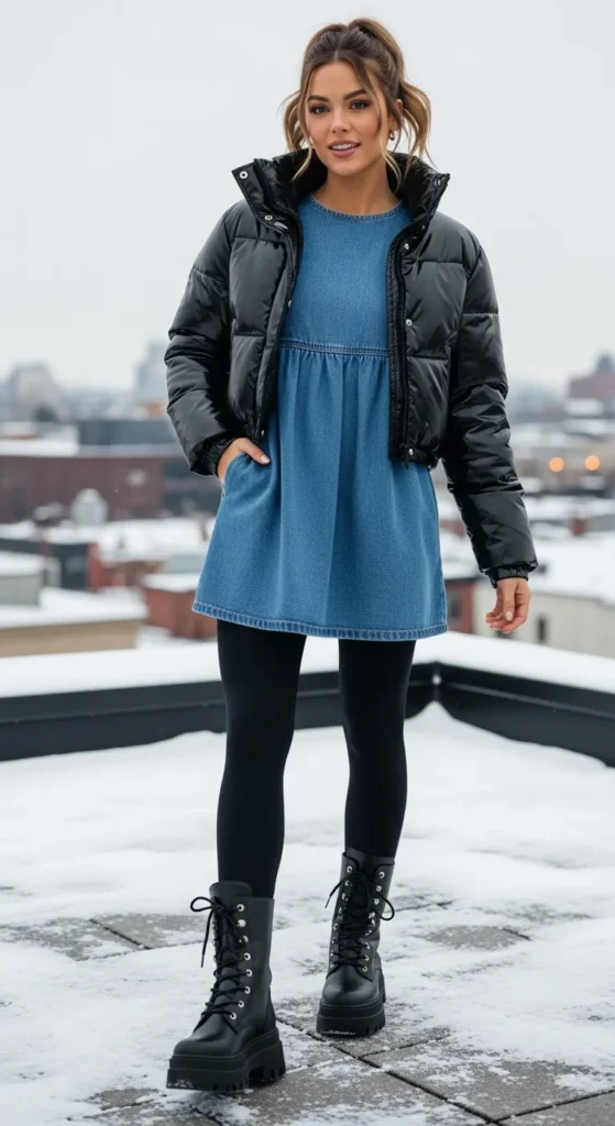 A puffer jacket adds modern winter energy to a denim babydoll outfit. The contrast between volume and flow creates a stylish, street-ready look that still feels warm and practical.