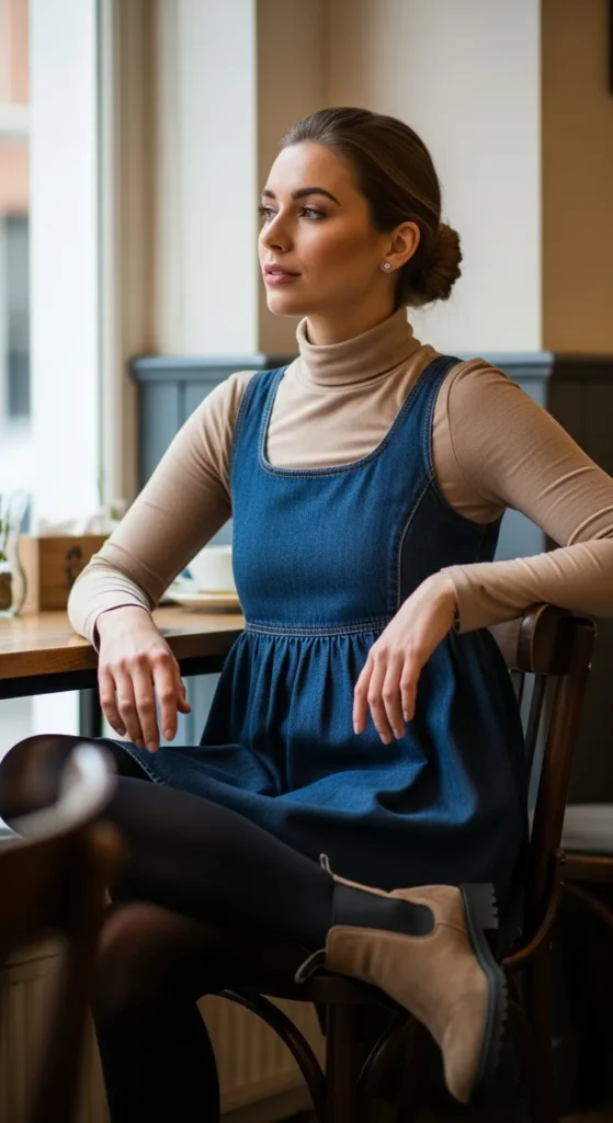 Layering a fitted turtleneck under a denim babydoll creates warmth without losing shape. This outfit feels neat, intentional, and effortlessly cute for winter days when you want comfort but still look put together.