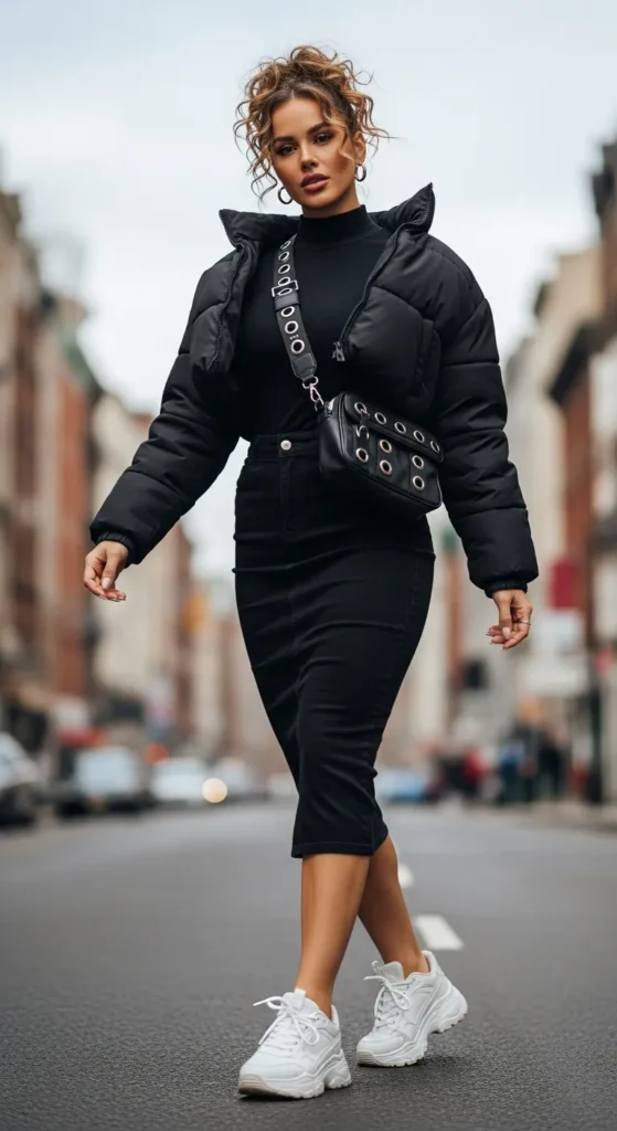 A black denim bodycon dress styled with a cropped puffer jacket feels bold, practical, and very now, making it ideal for cold casual days when comfort matters but style still leads.