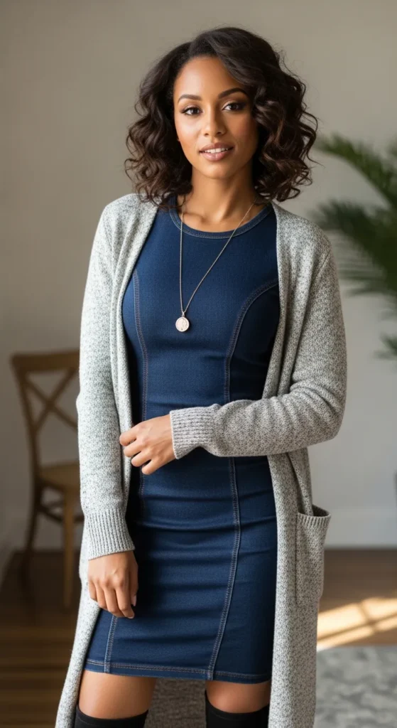A fitted denim bodycon styled with a buttoned cardigan feels approachable and warm, blending casual comfort with subtle shape for an easy winter outfit you can wear on repeat.