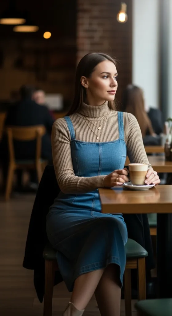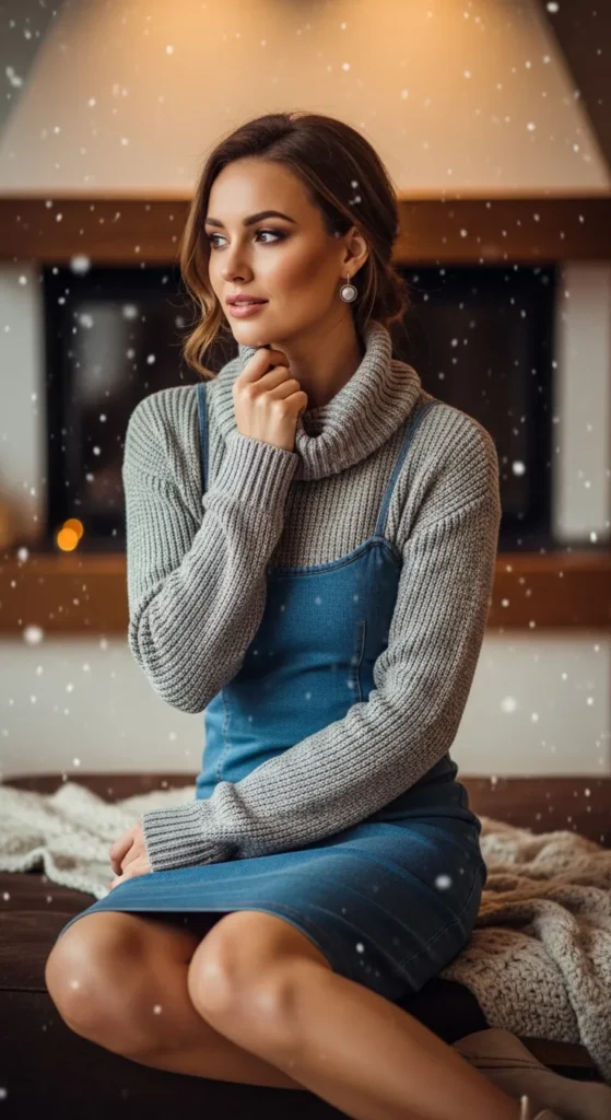 Layering a fitted ribbed turtleneck under a denim bodycon dress adds warmth without bulk, creating a sleek winter-ready outfit that feels smart, modern, and perfect for everyday cold-weather styling.