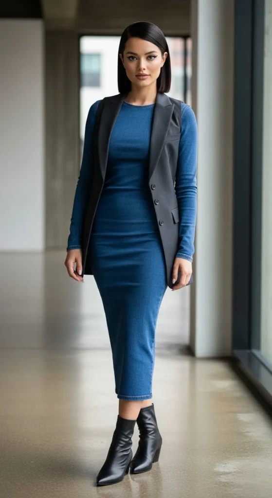 A long-sleeve denim bodycon dress paired with sturdy boots feels grounded and practical, offering warmth and confidence for winter days when you want one easy statement piece.