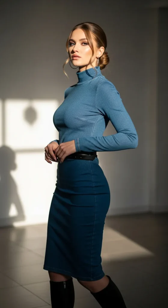 3. Denim Bodycon with Ribbed Turtleneck Base