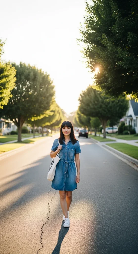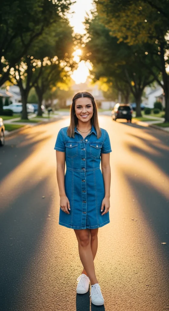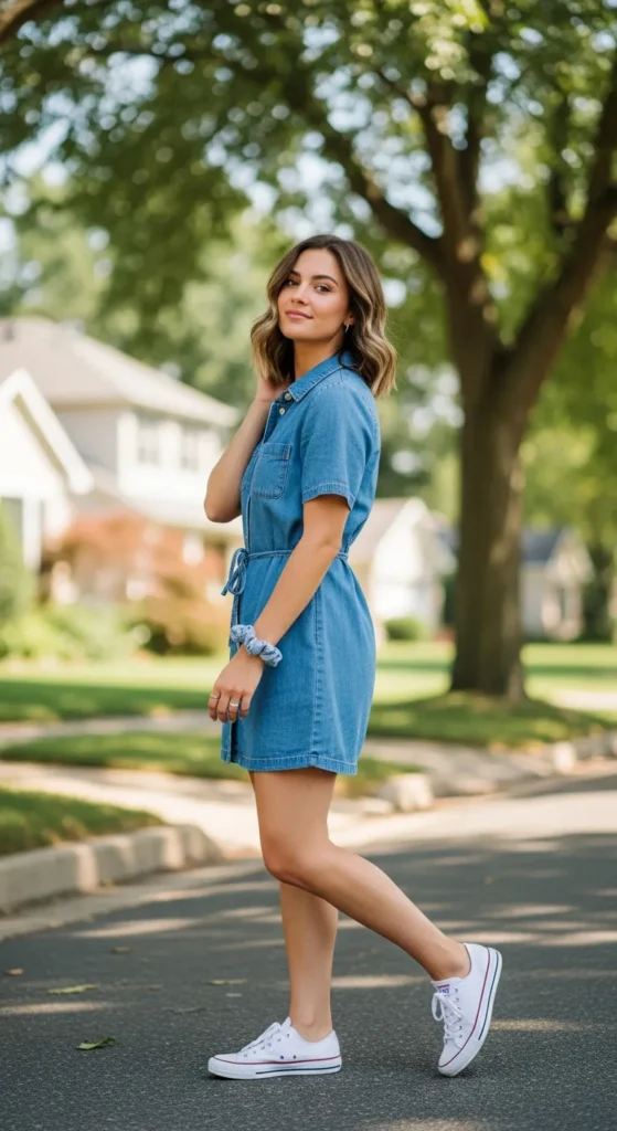 A button-front denim dress with classic sneakers brings subtle vintage energy without feeling costume-like. It’s simple, breathable, and easy to move in, making it perfect for everyday routines and casual meetups.