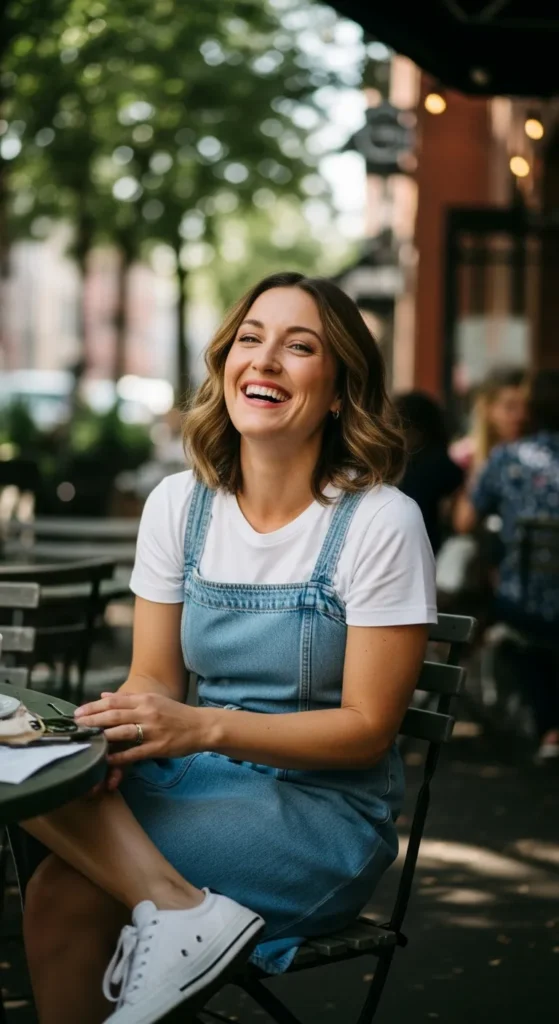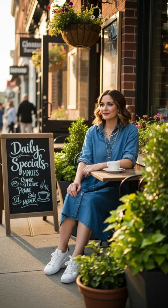 A light-wash denim dress with classic canvas sneakers feels youthful and relaxed. It’s the kind of outfit that works for errands, casual lunches, or spontaneous plans without any outfit stress.