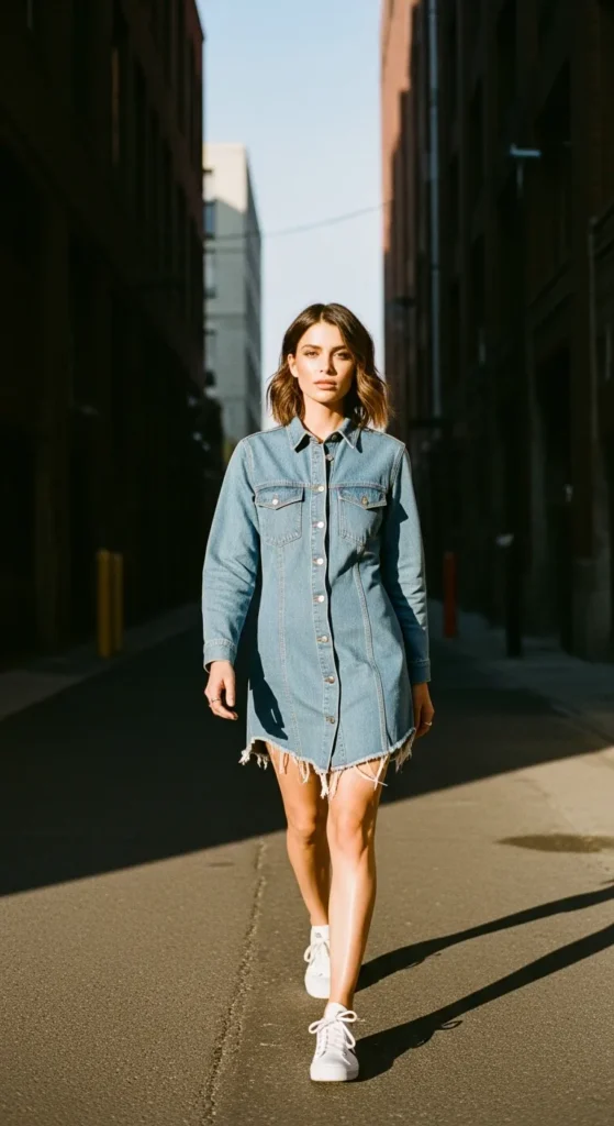An oversized denim shirt dress styled with chunky sneakers feels confident and carefree. It’s roomy, breathable, and ideal for days when comfort matters most but you still want that cool, intentional silhouette.