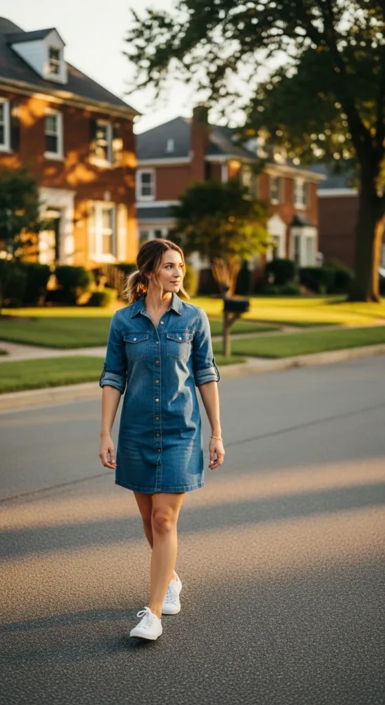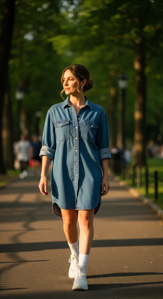 A denim dress with rolled sleeves and sneakers feels relaxed and approachable. It’s the kind of outfit that works for almost any casual plan.
