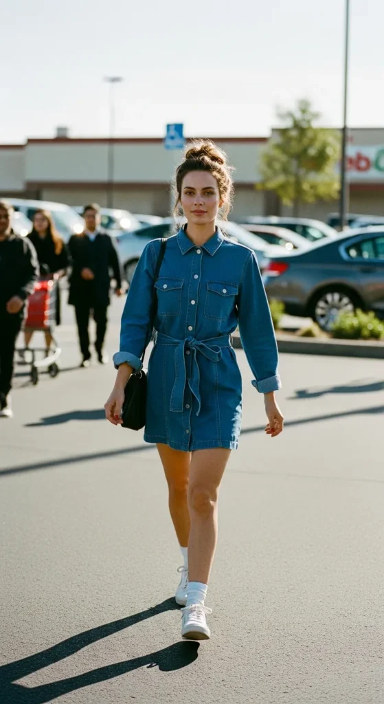 A denim mini dress with sneakers is perfect for quick errands and busy schedules. It feels playful yet practical, keeping you comfortable without looking rushed or unfinished.