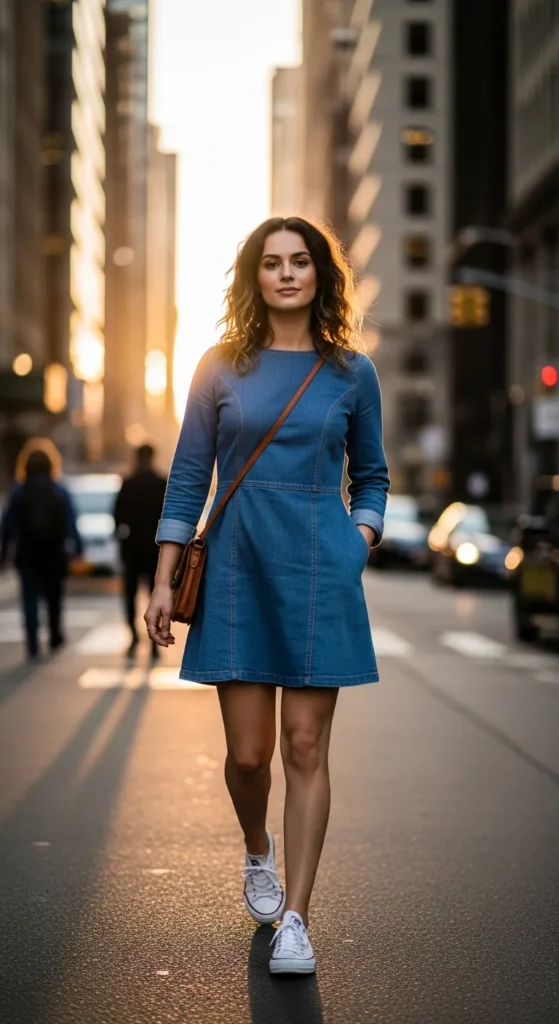 A straight-cut denim dress with sneakers offers clean lines and balance. It’s ideal for those who love simplicity and structure without sacrificing comfort.