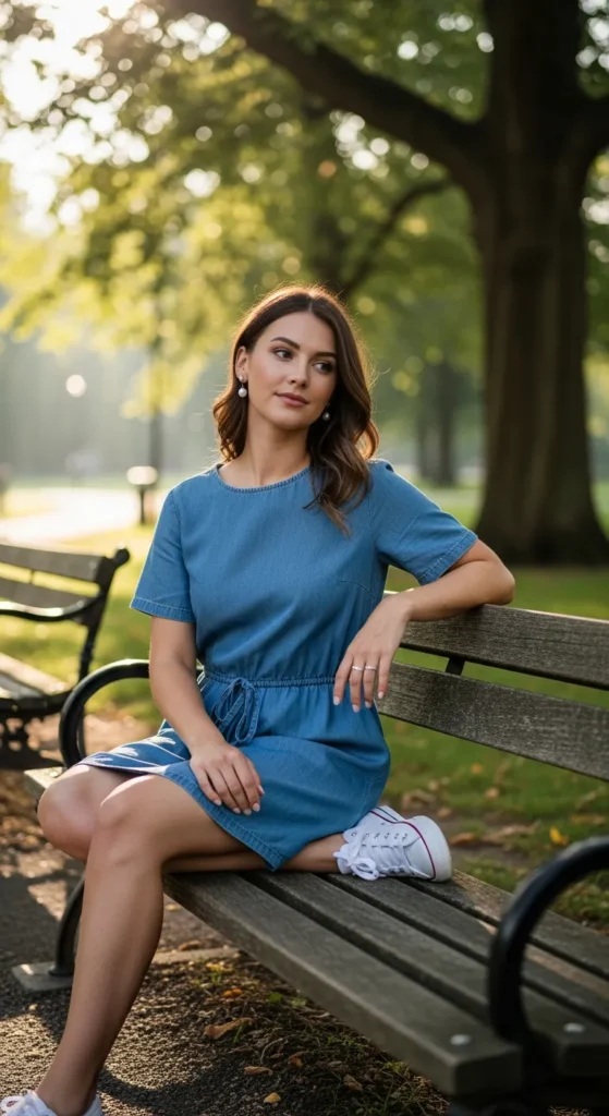 A relaxed-fit denim dress with sneakers gives you room to breathe and move. It feels casual, friendly, and ideal for long days where comfort and confidence matter equally.