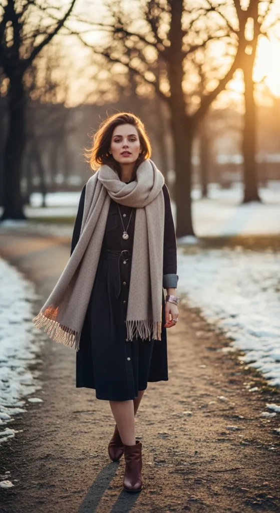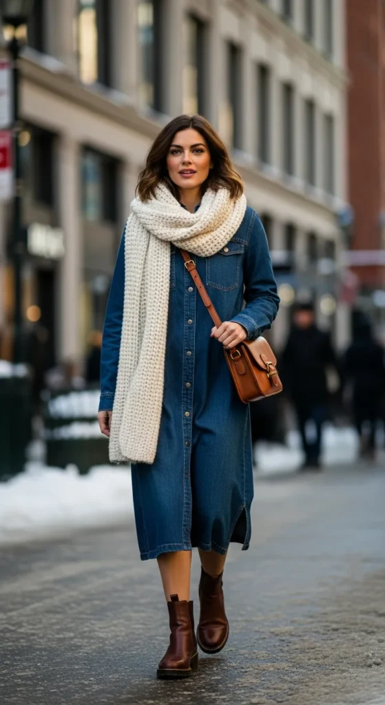 A dark-wash denim dress styled with a soft oversized scarf feels calm, cozy, and quietly chic. This outfit is perfect for cold days when comfort matters but you still want to feel pulled together.