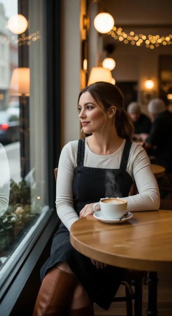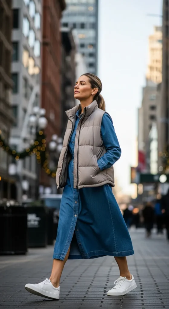 Layering a denim dress with a lightweight puffer vest adds warmth without heaviness. This outfit feels modern, active, and perfect for busy winter days when you’re constantly on the move.