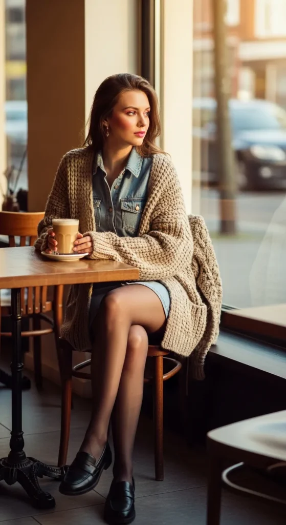 Stylist Suggestion: Let the cardigan stay oversized for contrast against the fitted denim. Add opaque tights and loafers to keep warmth without losing the casual charm of the look.