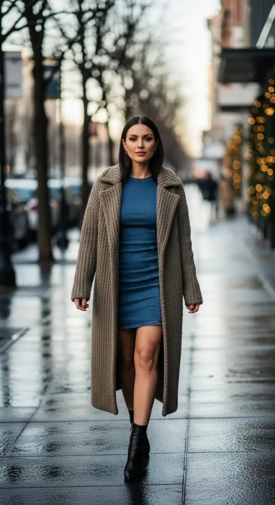 A fitted denim dress paired with a longline knit coat creates a sleek winter silhouette. It’s cozy yet flattering, offering a simple way to feel confident and warm without extra bulk.