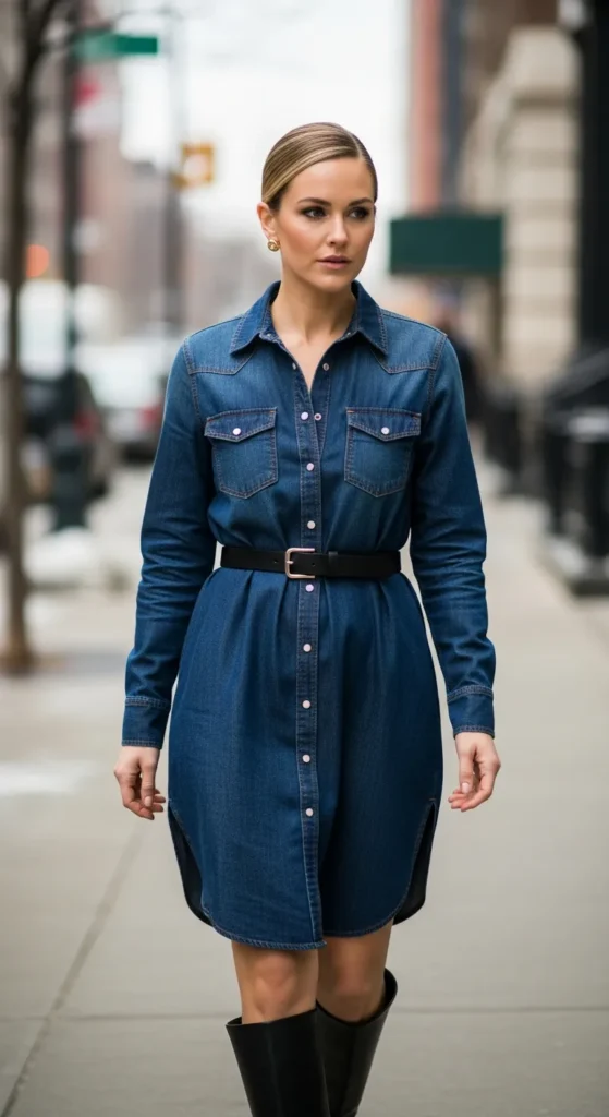 A long-sleeve denim shirt dress cinched at the waist creates an easy silhouette that still feels styled. It’s relaxed enough for everyday wear but sharp enough to feel confident and intentional all winter long.