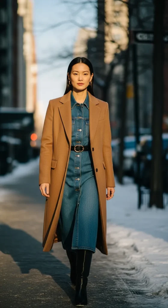 A midi-length denim dress paired with a structured wool coat feels timeless and elevated. The mix of casual denim and polished outerwear creates a balanced winter outfit that looks effortless but thoughtfully styled.