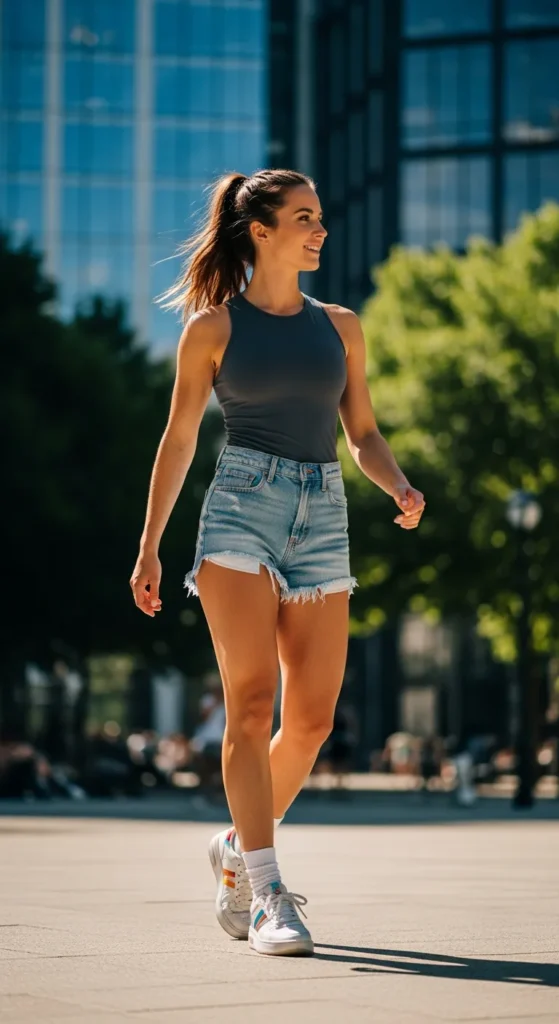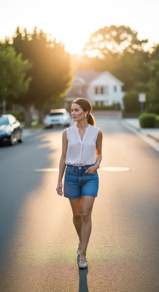 A lightweight knit tank with denim shorts gives subtle texture and polish. It’s relaxed yet refined, ideal for days when you want to feel put-together without sacrificing comfort.